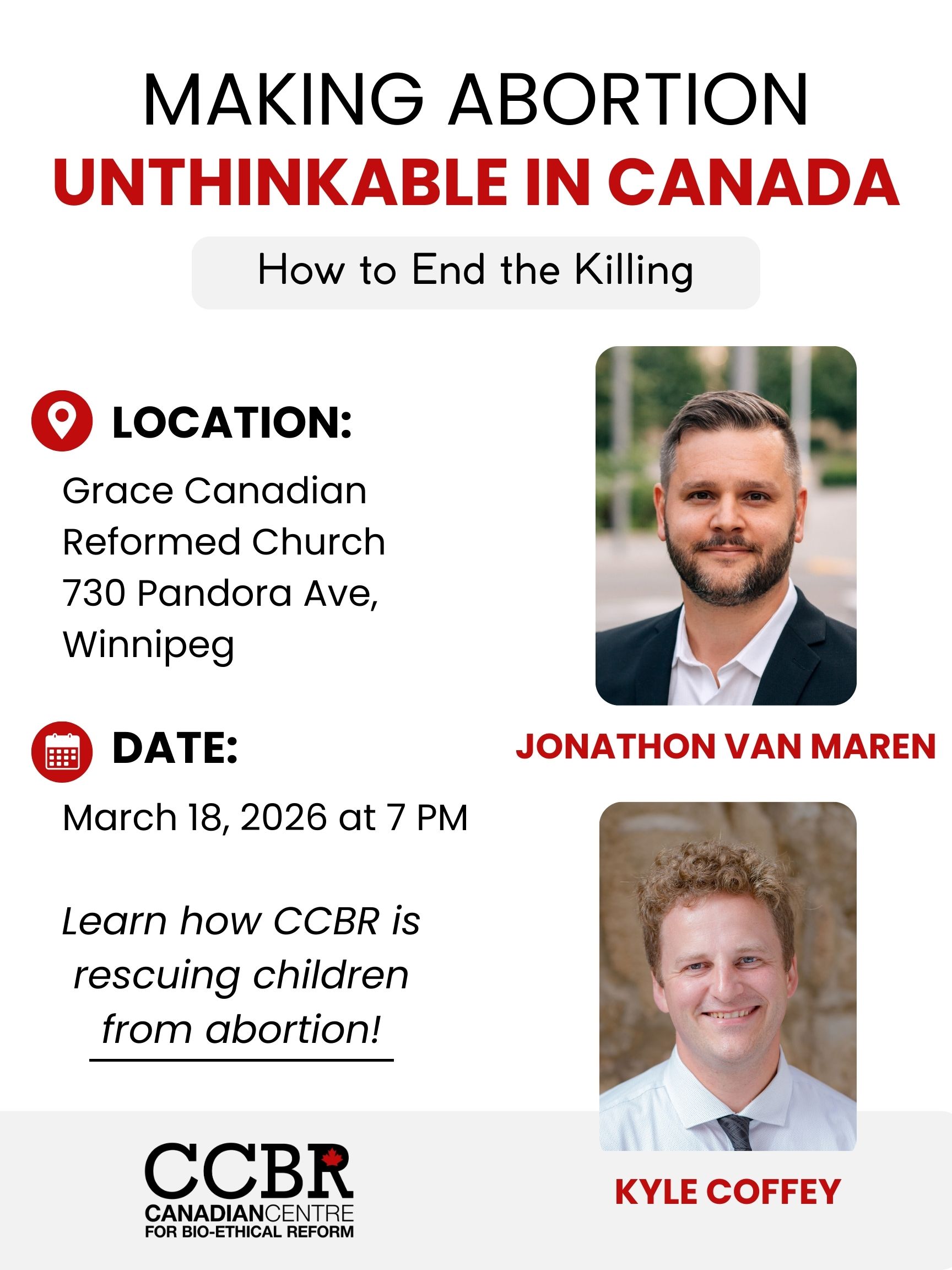 Jonathon Van Maren and Kyle Coffey present CCBR’s Making Abortion Unthinkable. Please join us at Grace Canadian Reformed Church at 730 Pandora Ave, Winnipeg, on Wednesday, March 18, at 7:00pm. Included in the evening are refreshments and opportunities to get involved in protecting pre-born children.